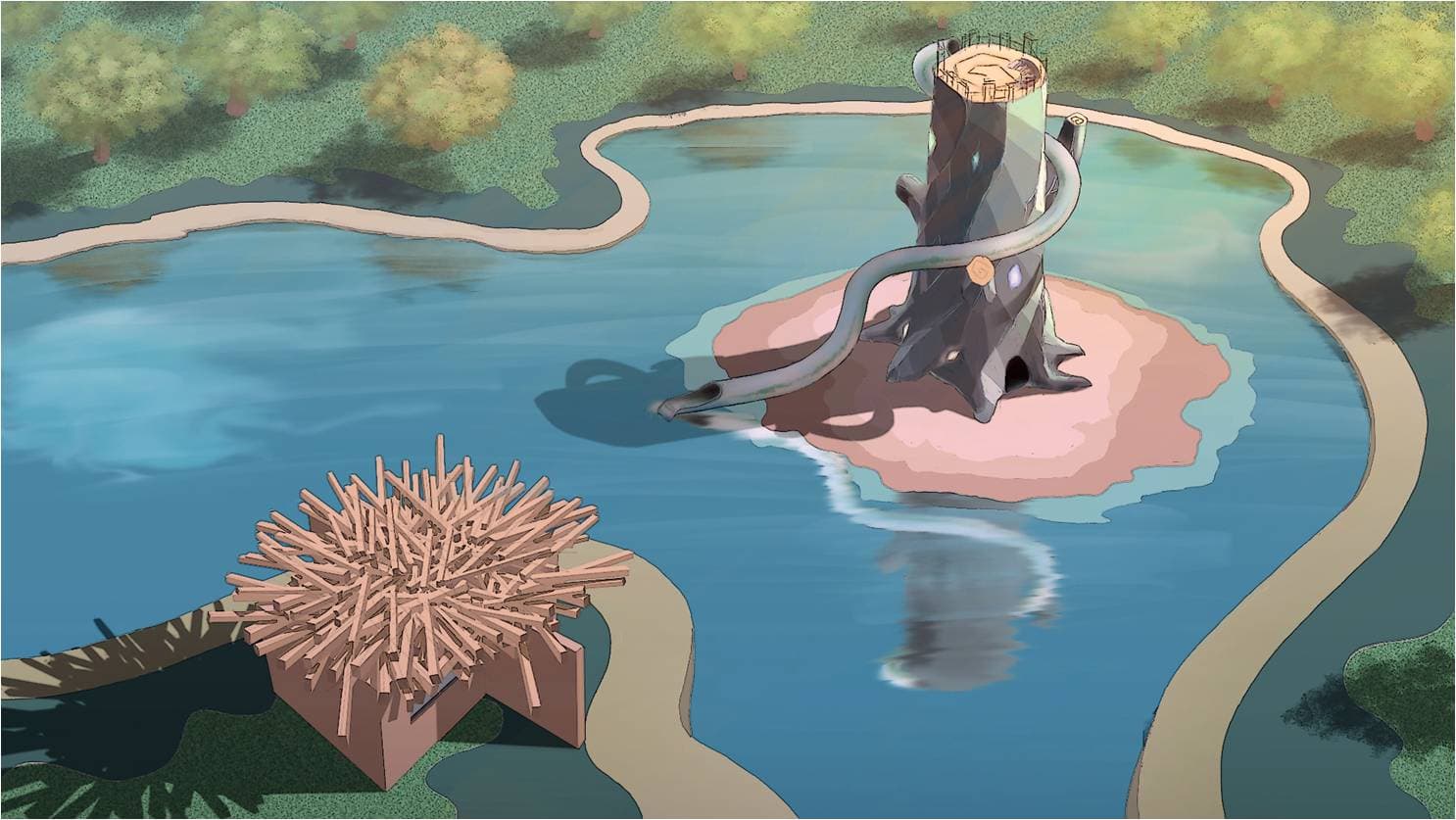 在王國的東北方向,生命之河的中央有一棵象征王國生命的神木。只有得到國王的允許,王國的孩子們才能夠踏上這神圣的頂峰。當(dāng)你踏上這神圣的頂峰,將會授予鸚鵡勇士的稱號。與之相望的是岸邊巨大的巢穴,這是鸚鵡王國孕育勇士的地方,神樹將給予它庇護(hù)。